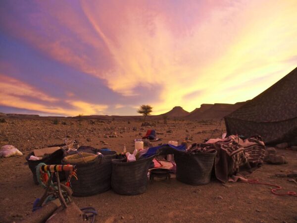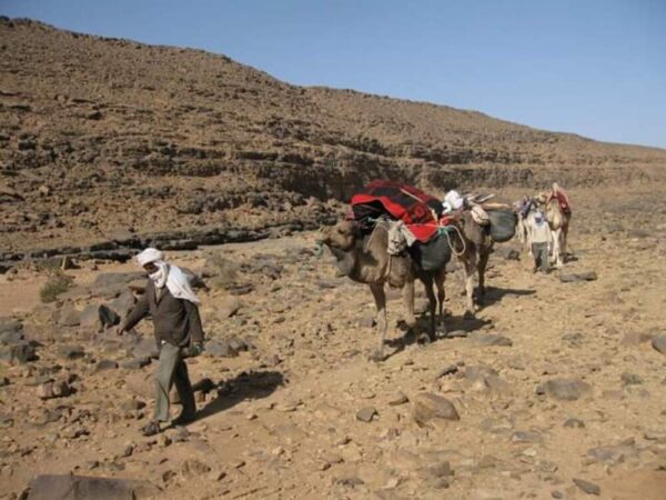 After waking up in the fresh air, we begin our hike in the vast desert landscapes. We meet our camel drivers, load the camels and begin crossing Jebel Bani, the natural boundary between the mountains and the desert plains. The walk across a rocky plateau takes us to the Oum Laachar Guattara pass then to the Diabi oasis, where we have lunch in the shade. We set up camp for the night near a small spring at the foot of Jebel Abbès.