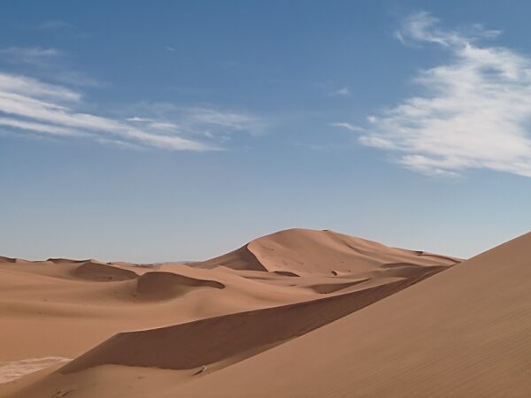 After breakfast, we begin our hike to pass through the Elabbas Gorges. Here, a vast sandy plain opens up, leading us towards the Chegaga dunes. At the foot of the dunes, we set up our camp near the well used by the nomads to water their animals.
